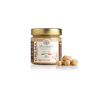 Bronte es un pequeño pueblo de la provincia de Catania en la isla de Sicilia y está situado en un maravilloso valle en las laderas del imponente volcán activo Etna. Crema de sabor intenso y fuerte, elaborada con avellanas de calidad, ideal en cualquier momento del día, perfecta para múltiples preparaciones. Para rellenar tus postres, o simplemente para untar sobre una rebanada de pan, cannoli siciliani, crepes, croissants, helado, tostadas, churros y otras preparaciones saladas.