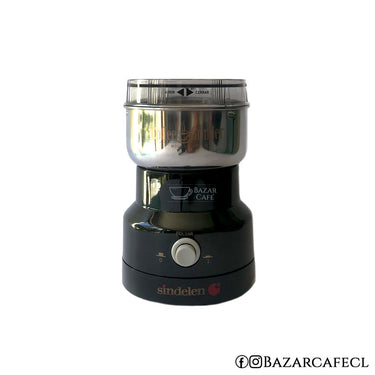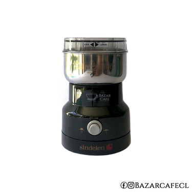 Molinillo de café Sindelen con un recipiente de acero inoxidable. Su diseño de vanguardia permite un uso fácil y su recipiente de acero inoxidable es de gran capacidad: permite moler café hasta 12 tazas grandes.