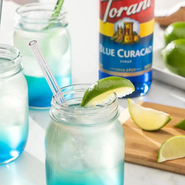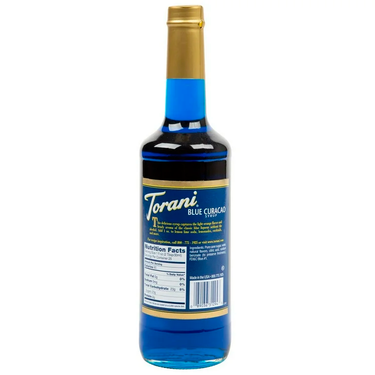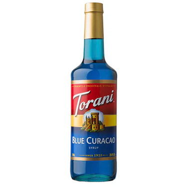 Jarabe Torani de Curazao Azul, fabricado con pura caña de azúcar y sabores naturales, perfecto para bebidas a base de café, té, frappe, café helados y batidos. Formato: Botella de vidrio, contenido neto: 750ML